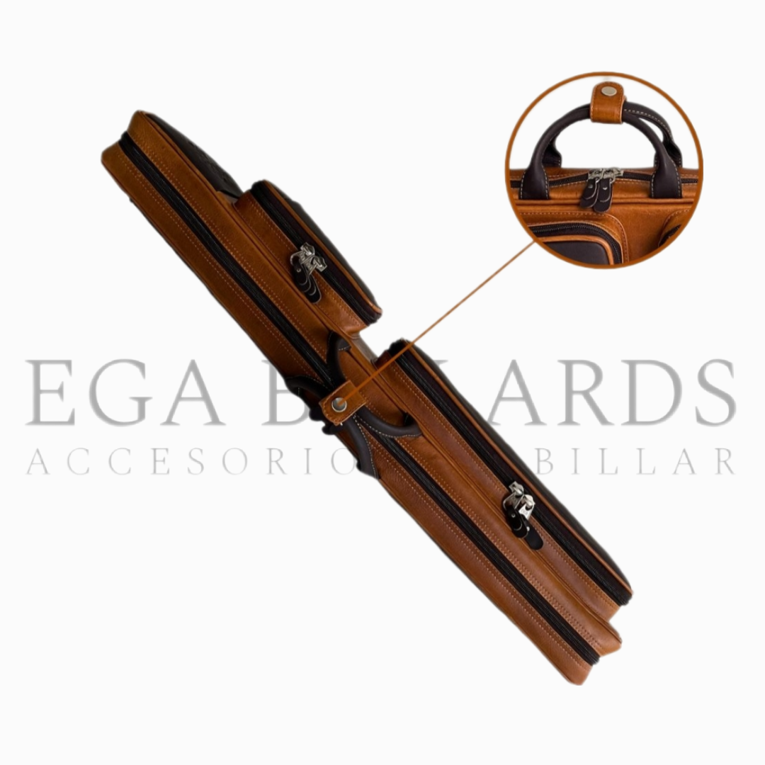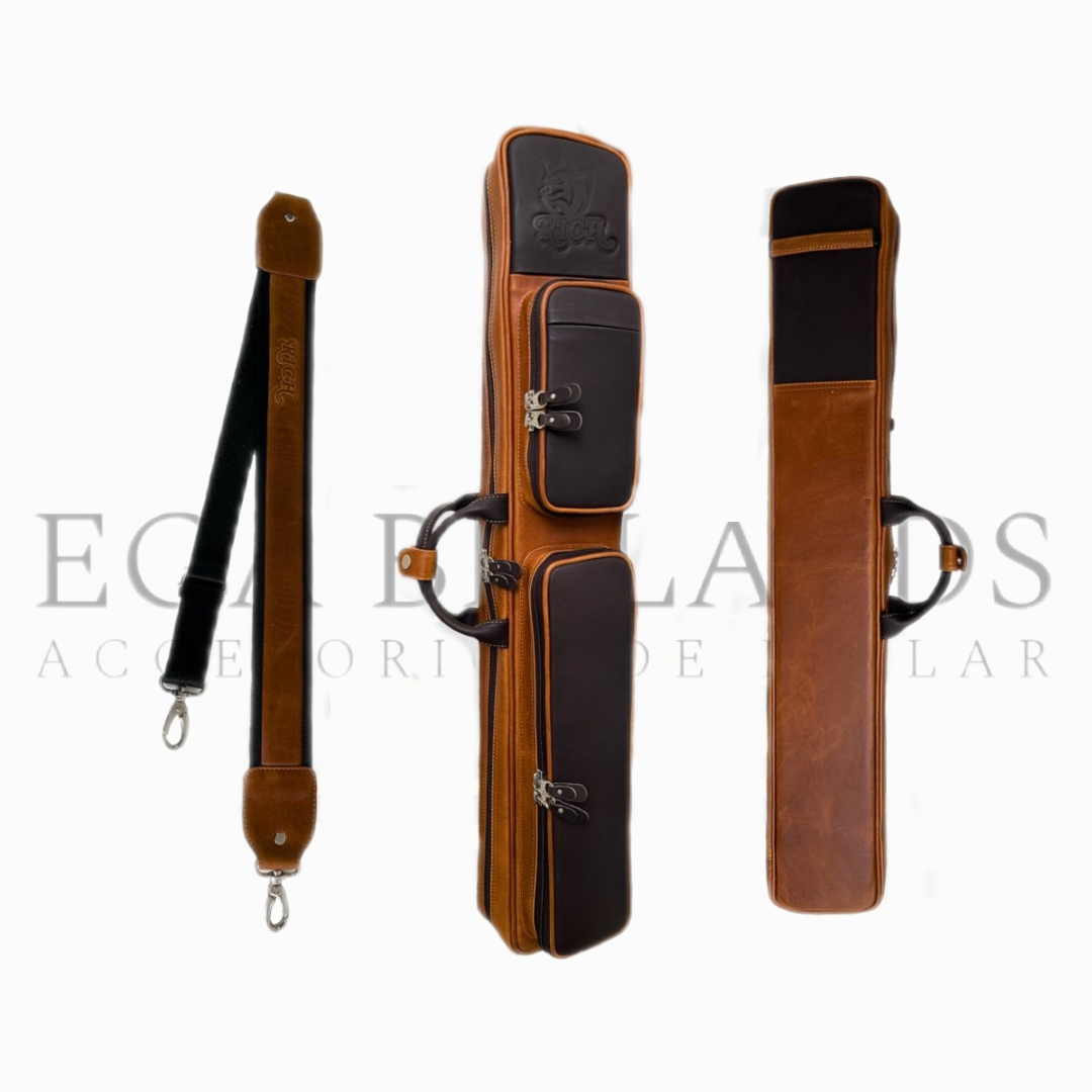 Eleva tu experiencia con el exclusivo Estuche RICH fabricado en cuero genuino de alta calidad Este elegante accesorio no solo asegura la máxima protección para tu taco de billar sino que también destaca por su diseño sofisticado y funcionalidad superior. Material: Cuero 100% natural. Para dos (2) culatas y cuatro (4) punteras.