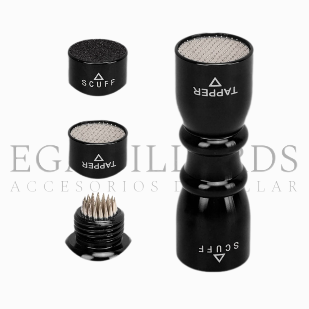 Herramienta todo en uno para Cuidar tu Taco, imprescindible para cualquier jugador de billar que quiera perfeccionar su juego. Este accesorio innovador combina tres funciones esenciales en un solo diseño; Pica para casquillo, golpeador para ajustes precisos y lija para acondicionar la suela.